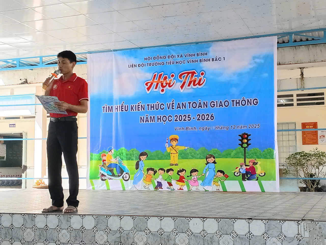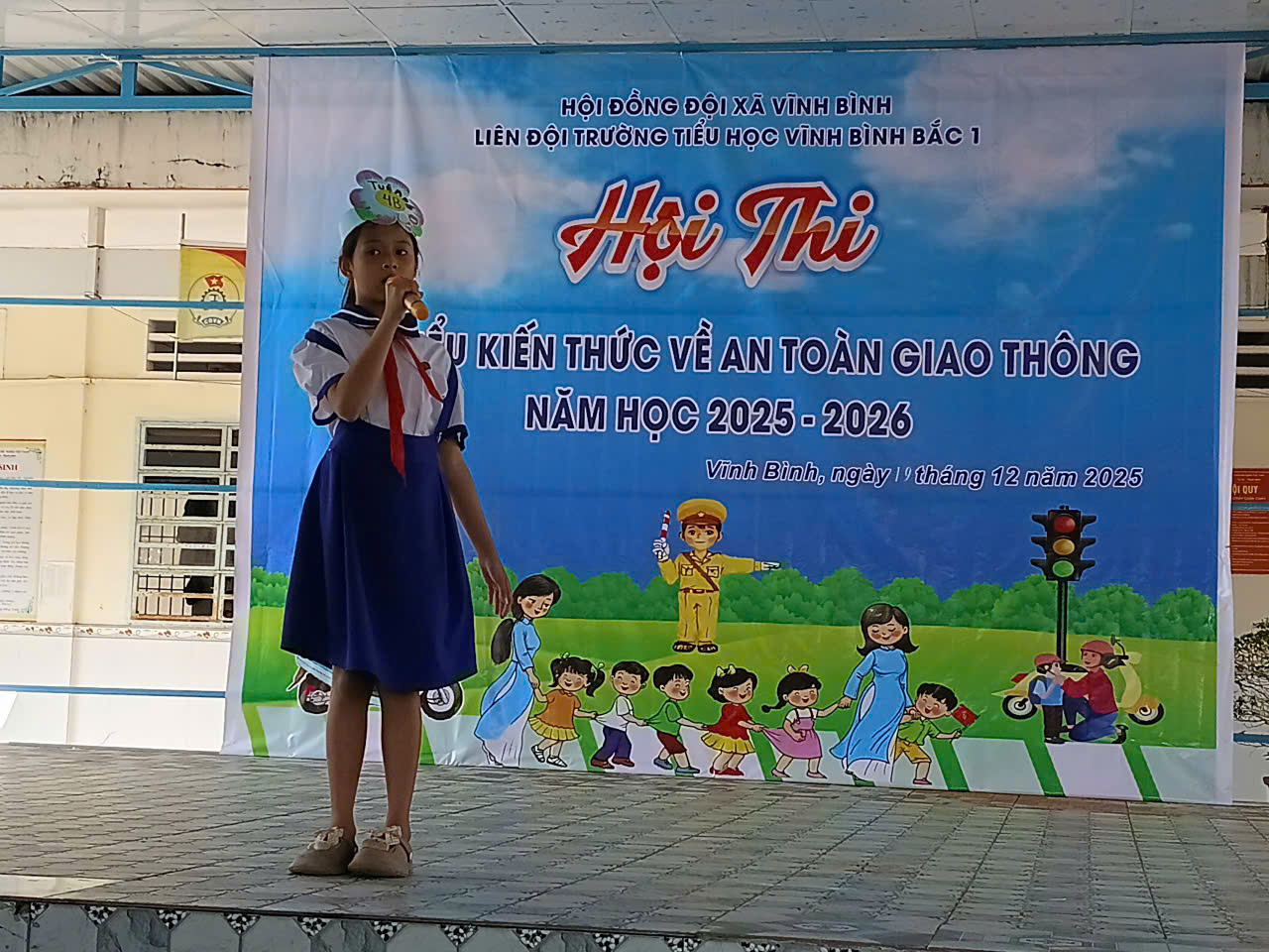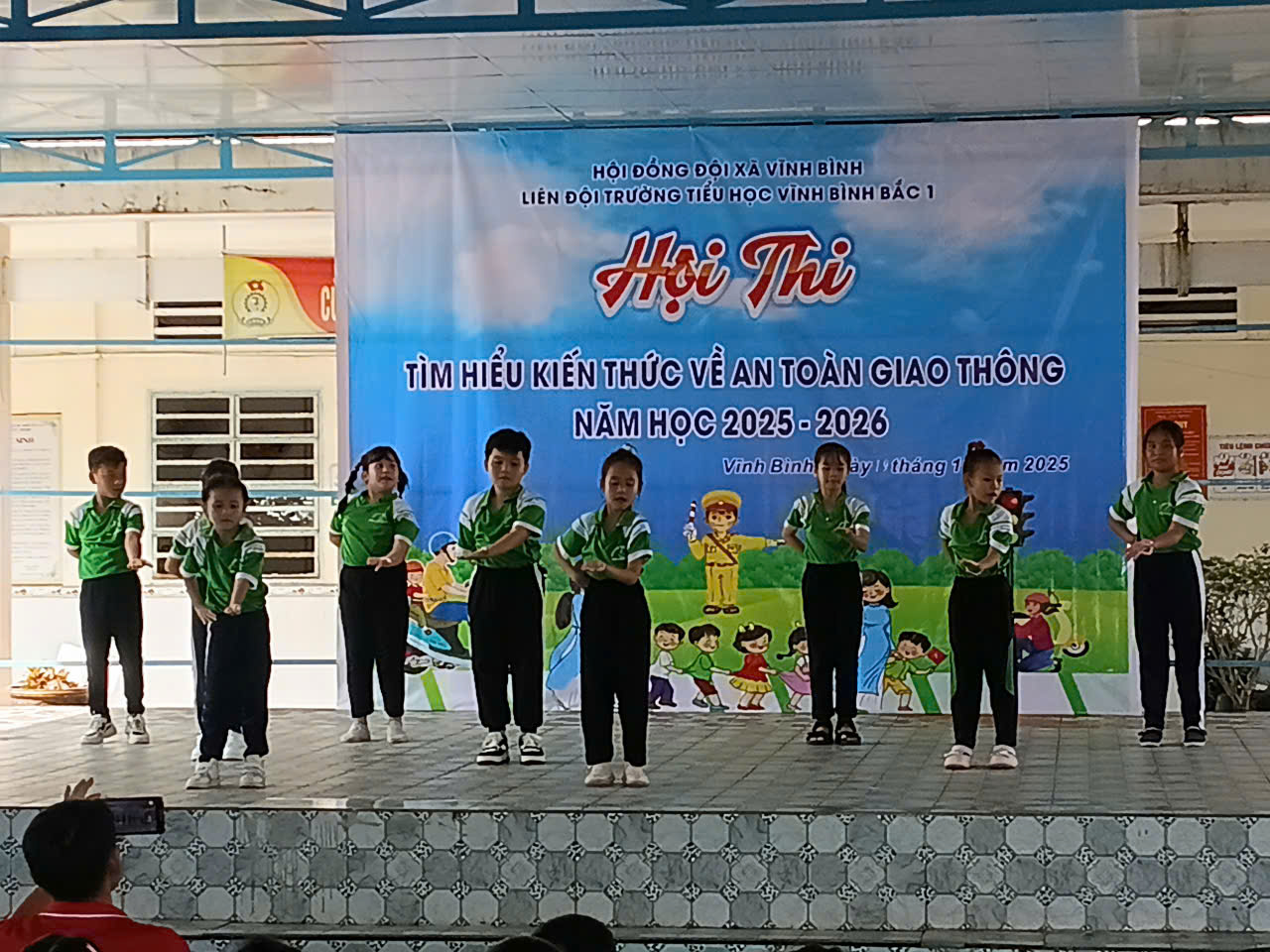 Ngày 19 tháng 12 năm 2025. Liên đội trường Tiểu học Vĩnh Bình Bắc 1 tổ ngày hội An toàn giao thông với các nội dung như: Hái hoa dâng chủ để trả lời các câu hỏi kiến thức về luật khi tham gia giao thông, thi cắt dán biển báo và vẽ tranh tuyên truyền về luật giao thông đường bộ.